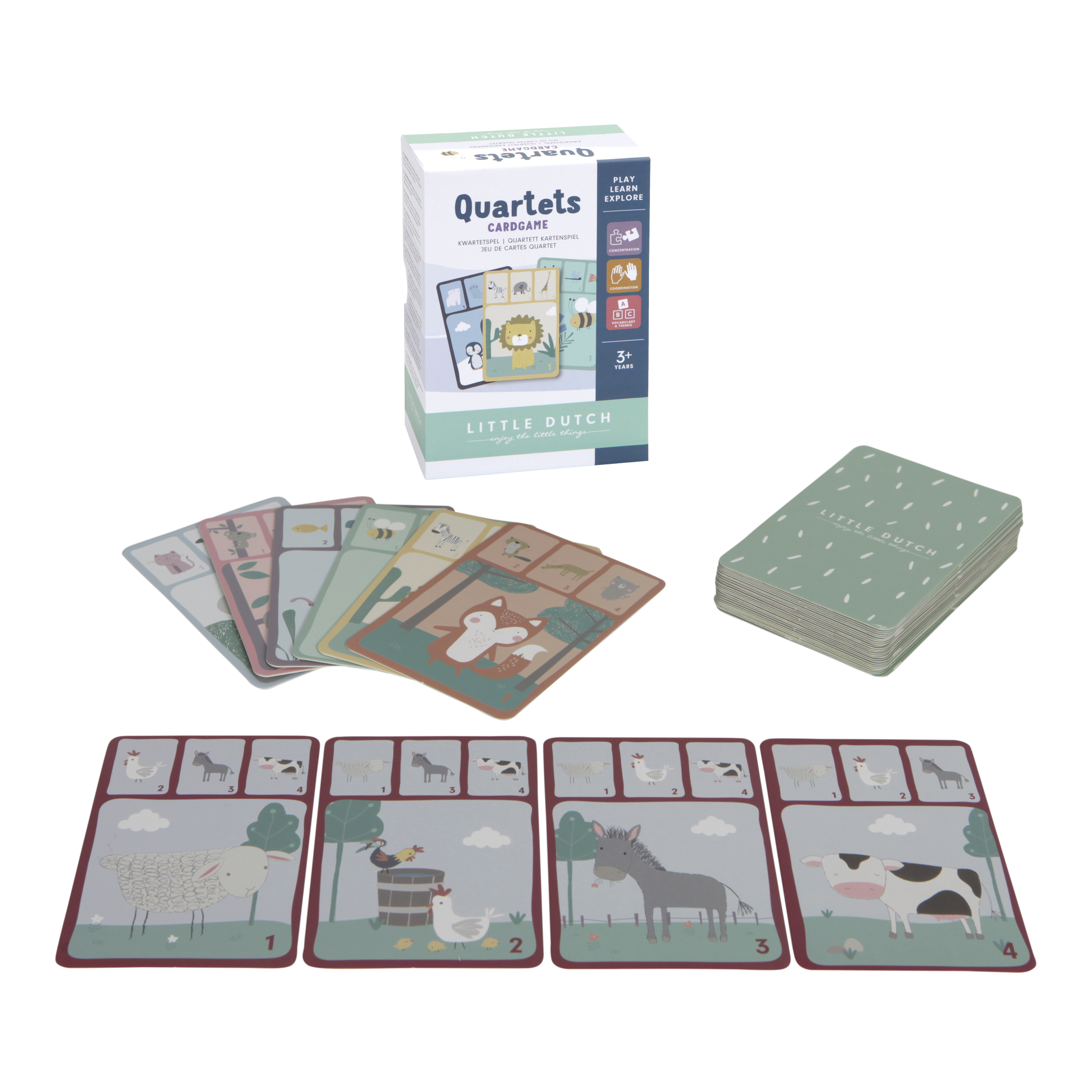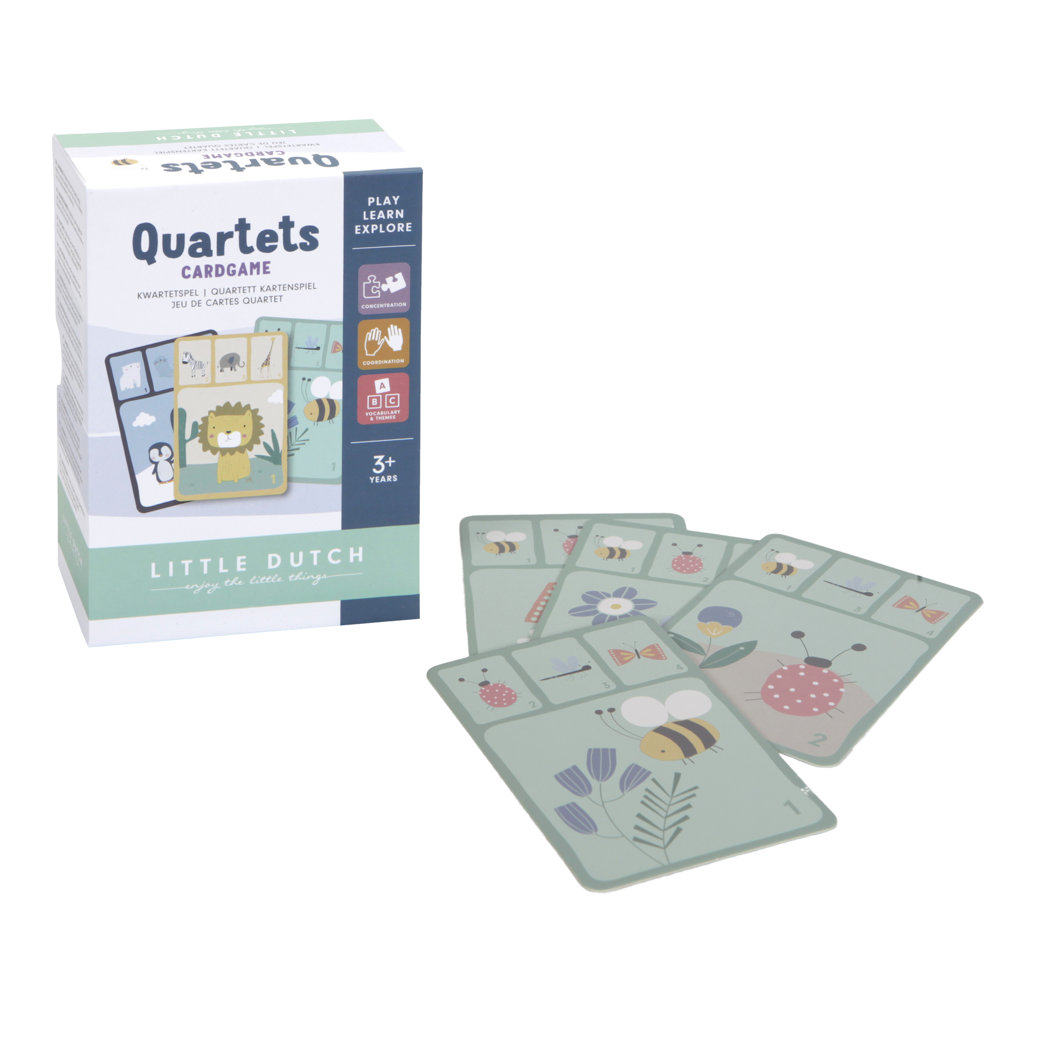 Dieses Little Dutch Quartett ist ein lehrreiches Spiel mit hübschen Tierillustrationen. Das Kind lernt nicht nur die Tiere kennen und sieht wo sie leben, sondern trainiert auch sein Gedächtnis und lernt auf spielerische Art wichtige Fähigkeiten, wie beispielsweise Konzentration und Spielentwicklung. Mindestalterempfehlung 3+ Jahre Produktgröße 13,5x9,2x5 Material Karton Farbe Mehrfarbig Kollektionen Andere Paketinhalt 1 Quartettspiel mit 36 Karten
